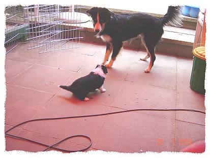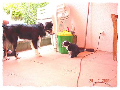 Hier hat Buster gerade Besuch von seinem großen Bruder Jackie (Arrow) und seinem neuen Herrchen bekommen. Buster guckt sich Jackie erstmal genauen und befindet Jackie dann für harmlos und ab geht's.......