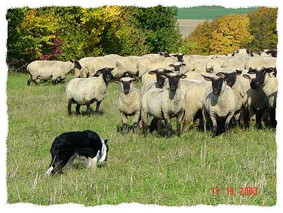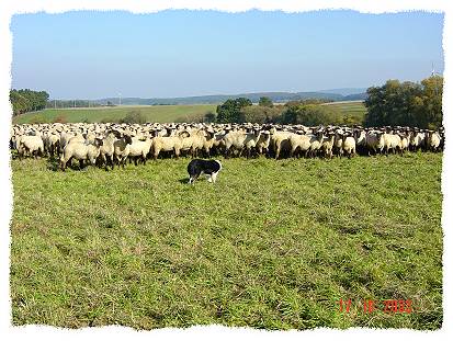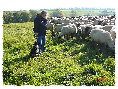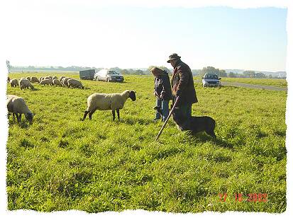 Mistie's erste Bekanntschaft mit einem neugierigen Schaf:-)) da kroch sie noch lieber zwischen meine Beine....... doch nach einer Weile konnten sie die Schafe nicht mehr schocken......und so ging ein erlebnisreicher Tag dem Ende zu.....