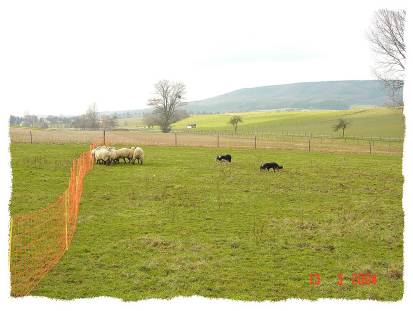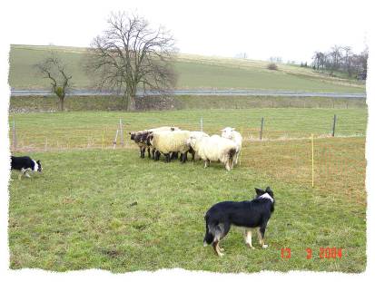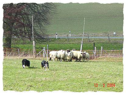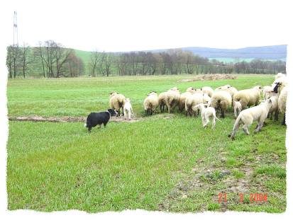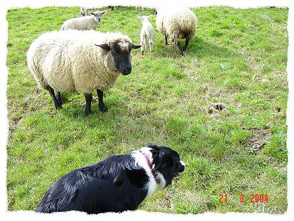 Hier sind Alex und Mistie bei "unseren" Schafen..... während wir nach dem Rechten sehen, treiben die beiden die Schafe in eine Ecke und passen auf, daß sie dort zusammen stehen bleiben.....