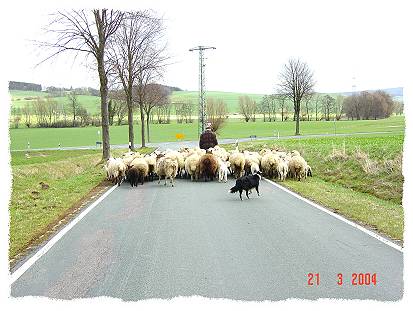 Hier soll die Herde weitergetrieben werden...... jaja, und unsere Rieke, die eigentlich nie was mit Schafen im Sinn hatte, hat im Alter von 5 Jahren ihre große Leidenschaft dafür entdeckt..... und wenn der Schäfer anruft und fragt ob Peter mitgehen kann die Schafe weitertreiben kommt jetzt auch immer die Frage "Bringst Du Rieke mit?":-)) Aber sicher bringt er Rieke mit, denn beim Schafe treiben ist sie unübertroffen...... Links werden die Schafe erstmal in Gang gebracht, das machen Rieke und Angie gemeinsam, rechts muß Rieke noch mit einem der Mutterschafe diskutieren, wer hier das sagen hat......