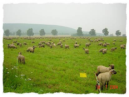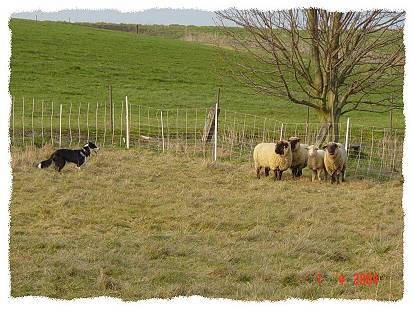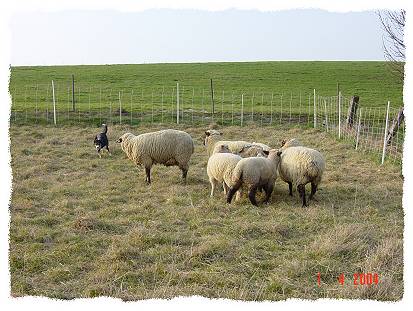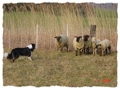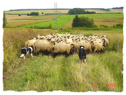 Hier sind wir auf unserer Weide und Mistie zeigt ihren Brüdern was sie immer mit den Schafen machen soll........ einmal drumherum laufen und dann alle schön zusammentreiben und dann hat man die Schafe in Ruhe zu lassen, wenn sie so stehen bleiben....., denn dann haben wir sonst Zeit die Netze weiterzustecken.