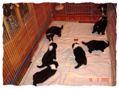 Gesagt, getan, das Welpengitter hat dieses Mal seinen Standort im Wohnzimmer, damit die Kleinen immer im Zeitgeschehen sind und außerdem ist der Weg von hier nach draußen auf die Terrasse und in die Wiese am kürzesten. Als Herrchen und Frauchen jeden meiner Kleinen einzeln runtergeholt haben, wurde auch jeder gebührend von Angie und Wuzzmann begrüßt und noch ein wenig abgeleckt, ganz fürsorglich und liebevoll, das war so richtig niedlich und hier meinte der Wuzzmann so kleine Hunde sind ja soooo toll, da möchte ich auch mit in das Gitter und mit den kleinen Mäuschen ganz vorsichtig spielen, die das natürlich gerne annahmen und ihm ausgiebig im Fell hingen:-))